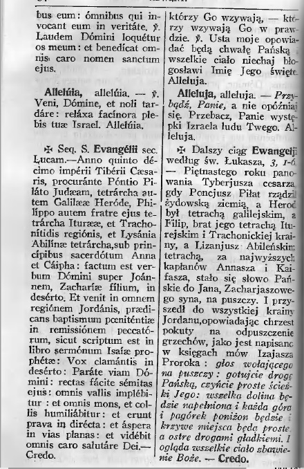 Roku piętnastego panowania Tyberiusza Cesarza, gdy Poncjusz Piłat rządził Żydowską ziemią, a Heród Tatrarcha Galilejskim, a Filip brat jego Tetrarchą Iturejskim i Trachonickiej krainy, a Lizaniusz Abileńskim Tetrarchą, za najwyższych kapłanów Annasza i Kajfasza: stało się słowo Pańskie do Jana, Zachariaszowego syna na puszczy. I przyszedł do wszystkiej krainy Jordanu, opowiadając chrzest pokuty na odpuszczenie grzechów: jako jest napisano w księgach mów Izajasza Proroka: Głos wołającego na puszczy: gotujcie drogę Pańską, czyńcie proste ścieżki jego. Wszelka dolina będzie napełniona, a wszelka góra i pagórek obniżon będzie: i krzywe miejsca będą proste, a ostre drogami gładkiemi: i ogląda wszelkie ciało zbawienie Boże.